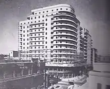 However, in the beginning, its owners had a hard time renting the accommodations to tenants as prices ranged from LE 6 to LE 12, which was exorbitant at the time (apartments then ranged between LE 2 and LE 3).[7] The owners then resorted to advertising campaigns in Egyptian and foreign newspapers. With seventy meters, the Immobilia building stood as the tallest building in Cairo at that time,[4][5] and the advertisements for the building apartments were boasting about its views of the Nile, the pyramids, and the cupola of the church of Saint George.[1] It was also the first building which offered an underground garage, with a capacity of up to 100 cars.[8] The campaigns highlighted the building's strong foundations that would not be affected by earthquakes, and stated that tenants would be exempted from paying rent for a period of three months. Soon enough, the Immobilia building became known for uniquely combining residential apartments and company offices. All of this led to its rapid rise, and the Immobilia Building quickly became the most prestigious residential address of Cairo, housing Egypt's most famous contemporary celebrities, such as Leila Mourad, Omar Sharif, Kamal El Sheikh, Naguib el-Rihani, Mohammed Abdel Wahab, Abdel Halim Hafez, Mohamed Fawzi, and Kamelya.[4] Famous visitors included the likes of Oum Kalthoum and King Farouk.[9]