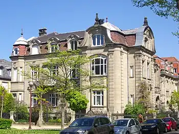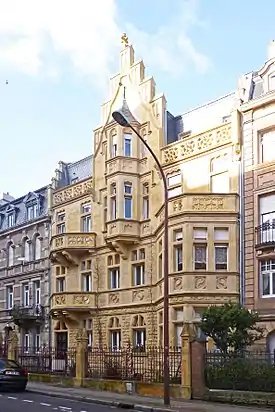 The urban guidelines of 1903 instituted a different status to the north side of the "ring" of open land that was opened up with the demolition of the old ramparts. It stipulated that this area should consist of houses encircles by gardens, having a maximum height of three floors, in order to soften the transition between the older buildings of the city center and the new, taller apartment houses that would populate the areas to the south. The villas on what is today known as the Avenue Foch in Metz exude this kind of neat and tidy character, reflecting the traditions of the period, and use a diverse, usually historicist, set of styles.[2]