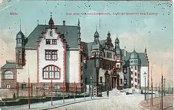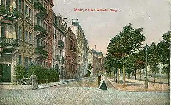 Up until the beginning of the twentieth century, the district was generally referred to as the Neue Stadt ("New City"), an area where the German authorities had decided to build a new extension south of the historic center of Metz. The enlargement of the city used the land ceded by the military garrison thanks to the removal of the old medieval city walls by order of Kaiser Wilhelm II in 1898, but most of the development only gathered steam starting in 1902. The moniker "New City" was reborn after the French regained control of Metz in 1918 in the name of the administrative district "Nouvelle Ville."[1]
