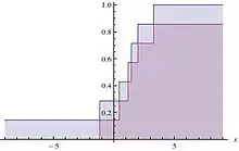 Lower (red) and Upper (blue) cumulative distribution for the observations {−1.17, 0.44, 1.17, 3.28, 1.44, 1.98}