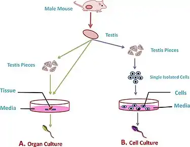 In fragment cultures, the testis is removed and fragments of tissue are cultured in supplemental media containing different growth factors to induce spermatogenesis and form functional gametes.[2] The development of this culture technique has taken place mainly with the use of animal models e.g. mice or rat testis tissue.