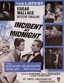 Incident at Midnight is a 1963 British crime film directed by Norman Harrison and starring Anton Diffring, William Sylvester and Justine Lord.[1] It was made at Merton Park Studios as part of the series of Edgar Wallace Mysteries, in this case adapted from one of Wallace's short stories.[2][3]