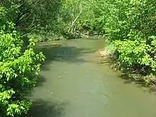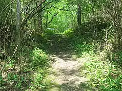 Both forks of Massies Creek flow through Cedarville Township from the east to their confluence in the township's center, whence the creek flows westward toward the Little Miami River. For the first 2 miles (3.2 km) below the confluence of the forks, the creek utilizes a shallow but sheer canyon that reaches as deep as 40 feet (12 m) below the surface of the surrounding terrain. Nathaniel Massie is reputed to have battled a Shawnee band under Tecumseh and forced them over the stream at the canyon.[2]: 537 By the early twentieth century, local residents had known the vicinity of the "Cliffs" as a picnicking ground for the past hundred years, and calls were being made for its conversion into a park.[3] In 1929, owners D.S. Williamson and a Xenia bank donated the Williamson Mound to the Ohio Historical Society.[4]: 547 Today, Indian Mound Reserve is operated as a unit of the Greene County Parks, which uses it to host events such as children's camps.[5] Hiking trails, picnic grounds, a log cabin, Cedar Cliff Falls, and the ancient earthworks are among the attractions within the park, which lies along U.S. Route 42.[6] The earthworks are located on opposite sides of the creek: the Pollock Works on the southern side, and the Williamson Mound approximately 100 rods (1650 feet, or 500 meters) away on the northern side.[7]: 34