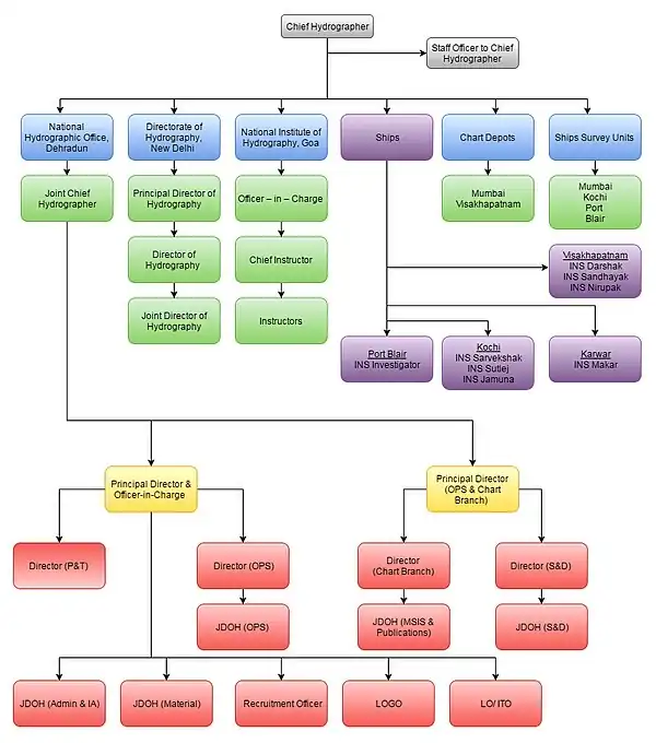 The department is headed by Chief Hydrographer, assisted by a staff officer. The organisation is further divided into 6 divisions.