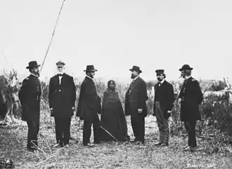 The Indian Peace Commission (also the Sherman,[1]:755 Taylor,[2]:110 or Great Peace Commission[3]:47) was a group formed by an act of Congress on July 20, 1867 "to establish peace with certain hostile Indian tribes."[4] It was composed of four civilians and three, later four, military leaders. Throughout 1867 and 1868, they negotiated with a number of tribes, including the Comanche, Kiowa, Arapaho, Kiowa-Apache, Cheyenne, Lakota, Navajo, Snake, Sioux, and Bannock. The treaties that resulted were designed to move the tribes to reservations, to "civilize" and assimilate these native peoples, and transition their societies from a nomadic to an agricultural existence.