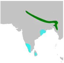 These birds arrive in the Himalayan breeding grounds in May and leave in September. Southward migration begins in August. During the migratory season they may be found as passage migrants all over peninsular India.[10][12][13] In winter they are found mainly in the hill forests of southern India,[14] the Western Ghats and in Sri Lanka. They arrive in mid-September and leave the winter quarters in mid-April. Males appeared to be commoner than females in a survey conducted in the Nilgiris suggesting either differences in the timing of migration of males and females or variation in wintering areas.[15][16] At Point Calimere they have been regularly trapped during October and November on their return migration from Sri Lanka but rarely on the southward migration with suggestions that they may follow different routes.[17]