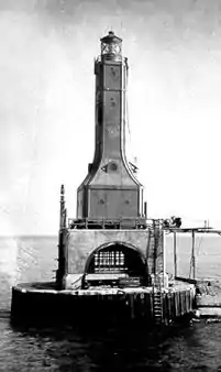 Indiana Harbor was constructed over several years, beginning in 1901, and this included a breakwater paralleling the east edge of the channel where it enters the lake.[4] In 1914 responsibility for the waterway and its facilities was assumed by the Corps of Engineers, and there is some indication that the Corps erected a lighthouse on the breakwater in 1920; however, information on its construction is lacking.