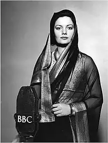She joined BBC Radio in 1939.[14] At that time, she lived at 512a Nell Gwynn House, Sloane Avenue, Kensington.[18] In 1941, she became political correspondent for the India team of the BBC, with George Orwell as the talk producer, and with the aim at enlisting Indian support for the War.[24] Others on the team included Mulk Raj Anand, Venu Chitale, Zulfiqar Ali Bukhari, T. S. Eliot and E. M. Forster.[24] She appeared regularly on the Home Service and the Eastern Service, and became affectionately known as the "Radio Princess".[25][26] She hosted talks with Indian men in technical training based in the UK, and a 30-minute programme called Hello Punjab, a programme in Hindustani for the British Indian Army based in the Middle East and the Mediterranean.[22][27] From the House of Commons, where she was sometimes the only woman in the press gallery,[8] she analysed and broadcast weekly reports to India in a programme called The Debate Continues.[22][27] With Narayana Menon she hosted the Indian Service musical programmes, and was familiar with popular and classical western music.[28] In 1943 she was appointed permanently at the Overseas Service Division.[25]