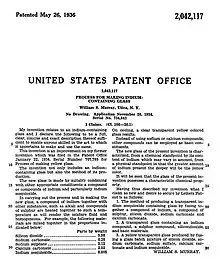 Originally applied for on November 26, 1934, Dr. Murray was awarded a patent for a "Process For Making Indium-Containing Glass" on May 26, 1936. The process produces a clear, transparent, yellow-tinted glass by heating glass with indium sesquioxide (In2O3) and various other materials.[48]