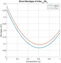 The bandgap and lattice constant of InAsSb alloys are between those of pure InAs (a = 0.606 nm, Eg = 0.35 eV) and InSb (a = 0.648 nm, Eg = 0.17 eV).[3] Over all compositions, the band gap is direct, like in InAs and InSb. The direct bandgap displays strong bowing, reaching a minimum with respect to composition at approximately x = 0.62 at room temperature and lower temperatures. The following empirical relationship has been suggested for the direct bandgap of InAsSb in eV as a function of composition (0 < x < 1) and temperature (in Kelvin):[1]