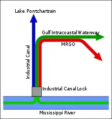 This simplified diagram shows how the southern half of the Industrial Canal also serves as the channel for the Gulf Intracoastal Waterway and the Mississippi River-Gulf Outlet Canal (MRGO).
