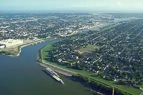 ![]() The Industrial Canal from the river to the lake. The Mississippi is at lower left and Lake Pontchartrain is at top in the distance. View is to the northwest. Picture taken before August 29, 2005. | |
