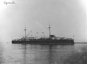 Laid down in January 1889, launched in 1891, and completed in 1893,[9] Almirante Oquendo was in Havana, Cuba when war with the United States became likely in the spring of 1898. Ordered across the Atlantic to join Cervera in the Cape Verde Islands,[8] she was sent along with her sisters to the Caribbean as part of Cervera's squadron, blockaded for 37 days in the harbor of Santiago de Cuba, and sunk in the Battle of Santiago de Cuba on 3 July 1898.
