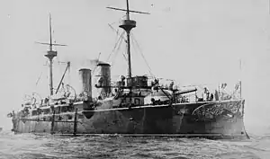 Ordered in 1889, launched on 8 July 1891, and completed in 1893,[7] Vizcaya was named for a Spanish province. She was visiting New York City at the time of the destruction of armored cruiser USS Maine in February 1898.[8] Ordered across the Atlantic to join Cervera in the Cape Verde Islands, she was sent along with her sisters to the Caribbean as part of Cervera's squadron, blockaded for 37 days in the harbor of Santiago de Cuba, and sunk in the Battle of Santiago de Cuba on 3 July 1898.