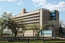 A new 385-bed Charles Camsell Hospital was completed in 1966-1967 at 128th Street and 114th Avenue in Edmonton, Alberta. The hospital was closed and abandoned in 1996, condemned due in part to asbestos, and in part due to its history in Canadian genocide and eugenics.[18] The hospital had been owned by a number of people over the years with development in mind, and some construction and gutting of the floors has taken place, but nothing substantial has been done. No actual development has been finished. The movie White Coats, released in 2004, was filmed in this hospital. In 2006, there was a fire in the building caused by a demolition crew, but firefighters had to fight the fire from the outside of the building since barbed wire had been wrapped around the railings of staircases, in a poor attempt to keep the homeless population out of the building. As of 2017, the building and grounds sit empty, and are surrounded by a fence. A private security service actively patrols the facility, and hefty fines are given to trespassers. In 2018, they’ve started to frame in the individual condominiums in the tower.