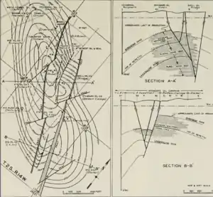 The Baldwin Hills area had tempted drillers for years, but all early attempts to find oil were unsuccessful, probably because erosion and faulting made the anticlinal structure appear farther east than it really was.[16] The first well to find oil was completed September 28, 1924 by Standard Oil Company, one of the predecessors of Chevron Corporation. Development of the field commenced rapidly but in a more orderly way than was usual for a Los Angeles Basin oil field.[17] Peak production occurred less than a year after the first well was installed. The first companies to work the field were Associated Oil Company, California Petroleum Corporation, O.R. Howard & Company, Mohawk Oil and Gas Syndicate, Petroleum Securities Company, Shell Company of California, and Standard Oil Company of California.[18]