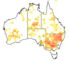 In Western Australia distribution covers the northern wheatbelt, the south-western interzone, the Murchison region, the Gibson desert and the Great Victoria desert.[7] In the Western Australian rangelands the species shows preference for Mulga woodland, while also choosing to inhabit Salmon Gum/Gimlet and York Gum woodlands.[7] In the semi-arid Mallee region of north-western Victoria inland broad-nosed bats show a preference for open woodland and dryland woodland habitats.[8] Other known occurrences in semi-arid regions in New South Wales are at Willundra Lakes and Kinchega National Park, along with Dangalli in South Australia.[8] In South Australia distribution in arid areas indicates a habitat preference for river red gums following surface drainage systems.[2]