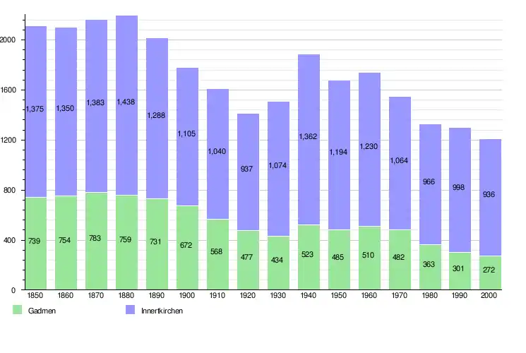 After the merger Innertkirchen has a population (as of December 2020) of 1,072.[10] As of 2011, 6.7% of the population are resident foreign nationals. Over the last year (2010-2011) the population has changed at a rate of -2.3%. Migration accounted for -4.2%, while births and deaths accounted for -0.2%.[11]