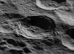 This crater has not been significantly worn due to impact erosion, and the features remain well-defined. The shape is roughly circular with a slight outward bulge along the western edge. The inner walls have slumped somewhat, and some slight terracing has occurred. The interior floor is relatively featureless, and is marked only by a few tiny craterlets.