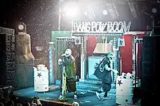The group's second studio album, Ringmaster, was released on March 8, 1994, and its popularity enabled the group to sell out larger nightclubs across Detroit.[14] Because Bruce and Utsler made reference to the Detroit-produced soft drink Faygo in their songs, they "figured it would be cool to have some on stage with [them]".[15] During a concert in 1993, Bruce threw an open bottle of Faygo at a row of concertgoers who were giving them the finger. After receiving a positive response, Bruce and Utsler have since continued to spray Faygo onto audiences.[15] A subsequent national tour increased sales of the album,[12] earning Ringmaster a gold certification.[16] The group's second EP, The Terror Wheel, was released on August 5, 1994. One of the songs from the EP, "Dead Body Man", received considerable local radio play.[12] The same year marked their first "Hallowicked" concert, which has since continued annually on Halloween night in Detroit.[12]