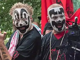 Insane Clown Posse, often abbreviated as ICP, is an American hip hop duo. Formed in Detroit in 1989, ICP's best-known lineup consists of rappers Violent J (Joseph Bruce) and Shaggy 2 Dope (originally 2 Dope; Joseph Utsler). Insane Clown Posse performs a style of hardcore hip hop known as horrorcore and is known for its elaborate live performances. The duo has earned two platinum and five gold albums. According to Nielsen SoundScan, the entire catalog of the group had sold 6.5 million units in the United States and Canada as of April 2007.[1] The group has established a dedicated following called Juggalos numbering in the "tens of thousands".[2]