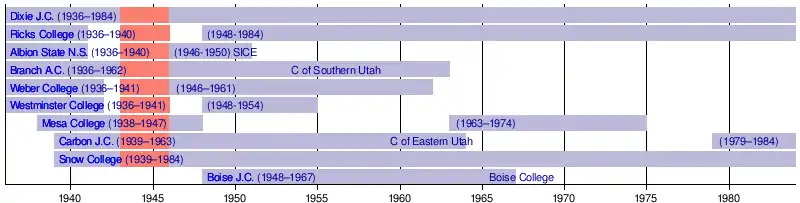 Over the years a number of schools entered and exited the league. In 1938, Mesa College joined the league. In 1939, the league saw its largest membership when Carbon Junior College (later College of Eastern Utah) and Snow College joined. In the early 1940s, the league saw disruption due to the outbreak of World War II – Ricks and Albion were forced to leave prior to the 1941 season, while Weber and Westminster were forced to leave prior to the 1942 season. The entire league suspended operations from 1943 to 1945. In 1946, the league resumed operations with Albion and Weber also re-joining the league. Prior to 1948, Mesa left the league, while Westminster and Ricks rejoined, and a new member also joined – Boise Junior College (later Boise College).