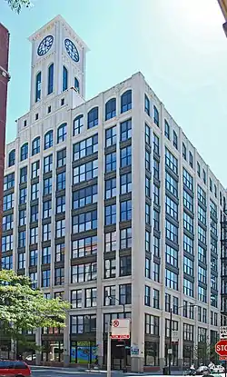 Designed by architects Mundie & Jensen and constructed in 1915–1916, with a substantial addition completed in 1922. In 1915–1916, when the International Tailoring Company built its ten-story building on Jackson Boulevard, it joined a handful of other businesses that since the 1890s had built and operated massive Chicago clothing factories. Established in 1896, the International Tailoring Company and its founder and president Jacob L. Reiss (1874-1955) rode the wave of clothing factory production. Where sweatshops were portrayed as dirty, cramped, dark, and unsafe, the modern clothing factory exemplified by Mundie & Jensen's design for the International Tailoring Company plant was clean, spacious, brightly illuminated by natural light, and constructed with an eye to worker comfort and safety.[3]