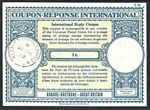 International reply coupons[1] (in French, Coupons-Réponse Internationaux) are printed in blue ink on paper that has the letters "UPU" in large characters in the watermark. The front of each coupon is printed in French. The reverse side of the coupon, which has text relating to its use, is printed in German, English, Arabic, Chinese, Spanish, and Russian. Under Universal Postal Union regulations, participating member countries are not required to place a control stamp or postmark on the international reply coupons that they sell. Therefore, some foreign issue reply coupons that are tendered for redemption may bear the name of the issuing country (generally in French) rather than the optional control stamp or postmark.