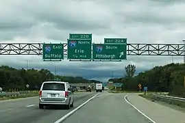 Interstate 90 (I-90) within the US state of Pennsylvania spans 46.297 miles (74.508 km), all within Erie County, from the Ohio border near West Springfield to the New York border near North East. I-90 is the primary west–east highway in the Erie area, passing south of downtown and having interchanges with I-79, which connects Downtown Erie to southern Pennsylvania and beyond, and I-86, linking Erie to the Southern Tier of New York. U.S. Route 20 (US 20), which has an interchange with I-90 near the New York–Pennsylvania border, parallels I-90 across the county. Throughout its length, I-90 has also been designated as the AMVETS Memorial Highway, with signs posted at each state line.