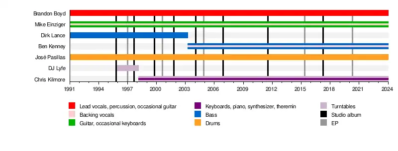 Guitarist Mike Einziger stated in 2017 that the band's diversity is "our greatest asset and our biggest flaw. We don't fit anywhere and we never have. We were never punk rock enough for the Warped Tour, we were never metal enough for Ozzfest, we were never quite indie rock or cool enough for Lollapalooza. We've carved our own path, and we're really humbled by the fact that we've had so many supporters and people who appreciate our music."[62] The band has also used a wide variety of instruments in their music that are not traditionally associated with use in rock music, including a djembe, sitar, didgeridoo, and bongos on many of their earlier tracks and during live performances, and with the use of a pipa given to the band by rock musician Steve Vai which is played by Einziger in the song "Aqueous Transmission".