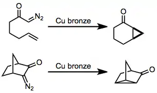 Either copper powder or copper salts can be used very generally for intramolecular reactions of diazocarbonyl compounds. This section describes the different types of diazocarbonyl compounds that may undergo intramolecular reactions in the presence of copper. Note that for intermolecular reactions of diazocarbonyl compounds, the use of rhodium catalysts is preferred.[2]