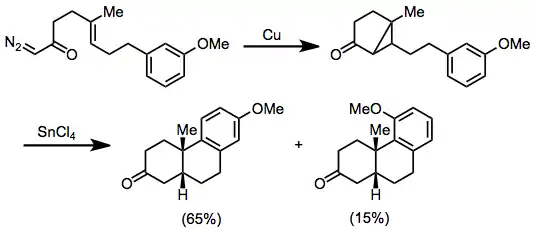 Intramolecular cyclopropanation of a diazoketone is applied in a racemic synthesis of sirenin. A single cyclopropane diastereomer was isolated in 55% yield after diazoketone formation and cyclization.[16]