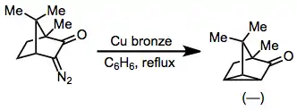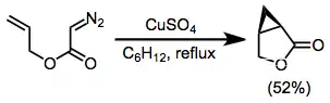 In the presence of an appropriate transition metal (typically copper or rhodium[2]), α-diazocarbonyl compounds are converted to transition metal carbenes, which undergo addition reactions in the presence of carbon–carbon double bonds to form cyclopropanes.[3] Insertion into carbon–carbon or carbon–hydrogen bonds is possible in substrates lacking a double bond.[4] The intramolecular version of this reaction forms fused carbocycles, although yields of reactions mediated by copper are typically moderate. For enantioselective cyclopropanations and insertions, both copper- and rhodium-based catalysts are employed, although the latter have been more heavily studied in recent years.[5]