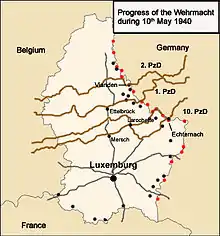 The German invasion began at 04:35 when the 1st, 2nd, and 10th Panzer Divisions crossed the border at Wallendorf-Pont, Vianden, and Echternach respectively.[21] Wooden ramps were used to cross over the Schuster Line's tank traps.[12] Fire was exchanged, but the Germans did not encounter any significant resistance except for some bridges destroyed and some land mines since the majority of the Luxembourgish Volunteer Corps stayed in their barracks. The border was defended only by soldiers who had volunteered for guard duty and gendarmes.[2] A handful of Germans secured the bridge at Wormeldange and captured the two customs officers there, who had demanded that they halt but refrained from opening fire.[14] The partly demolished bridge over the Sauer at Echternach was quickly repaired by engineers of the Großdeutschland regiment, allowing the passage of the 10th Panzer Division. Planes flew overhead, heading for Belgium and France, though some stopped and landed troops within the country.