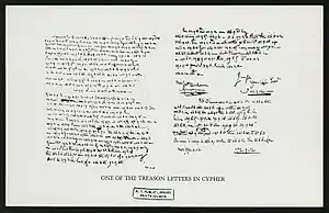 Giovanni Battista della Porta is credited with the first recipe for a sympathetic ink, derived from alum and vinegar, as well as the first book on secret writing and invisible inks, Magia Naturalis (1558, 1589).[8][4]:24 Since then, a wide variety of invisible inks have been used for all sorts of secretive purposes. A formula similar to oak gall ink was created by James Jay and used by George Washington and the Culper Spy Ring during the American Revolution and lemon juice was used by the 'Lemon Juice Spies' (Carl Muller and 4 other Germans, who all died for their efforts either by suicide or execution, along with John Hahn, an English baker) during World War I.[6][4] In World War II, neutral or acidic solutions of phenolphthalein, a chemical compound extracted from pills for constipation, were used as invisible ink.[9] It is colorless but turns pink when exposed to alkali such as ammonia and bicarbonate soda.[9]