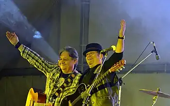 In April 2009, Pascu provided the comedic intermezzos at UNITER Awards Gala, but his performance received mixed reviews.[33] Three months later, he was the opening act for American folk artist Suzanne Vega at her Bucharest show.[15][34] Pascu noted that he had honored the invitation only after consulting with his daughter, a Vega fan, and that he adapted his electric guitar songs to the "unplugged" setting, playing the mandolin.[15]