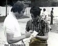 Ion Oblemenco's father was a Ukrainian named Andrei, while his mother, Margareta was from Oltenia, Ion being the couple's first child as the couple had two more daughters.[6] In 1969 he married Margareta Lepădatu, who was a volleyball player at Universitatea Craiova and in 1972 she gave birth to the couple's only child, a daughter named Clara who married footballer Adrian Pigulea.[6][30][31] During his life, Oblemenco had some serious health problems as in October 1972 he was diagnosed with peptic ulcer, a disease for which he was operated twice and was absent from the field until March 1973 when The Gunner scored a hat-trick in a 6–4 away victory against Rapid in his first game after the operation, also in February 1996 he had a car accident in which he fractured one of his legs.[4][6][7][8][11][17] While he was in his last spell of his coaching career in Morocco, on 1 September 1996 during a match between the team he was managing, Hassania Agadir, and fellow Romanian Alexandru Moldovan's team, Union Sidi Kacem Oblemenco suffered a heart attack after getting mad that in the final minutes of the game, while the score was 1–1, his team scored a goal but the referee cancelled it, Moldovan was the first to alert the medical teams of his situation who came and gave him first aid, also taking him to the hospital where he died that day at age 51.[2][3][6][8][9][10][11][12][17][27][28] He was named posthumously Honorary Citizen of his native Corabia and Craiova, having statues in both of these towns, the one from Craiova being displayed in front of the Ion Oblemenco stadium which is named in his honor same as the stadium from Corabia, also Hassania Agadir named their conference room after him.[4][3][6][10][11][23][24][27][28] Two books about him were written, the first was called Ion Oblemenco și campioana unei mari iubiri (Ion Oblemenco and the champion of a great love) and appeared in 1975 with the author being Marius Popescu and the second volume was called Oblemenco, meciul cu viața (Oblemenco, the match with life) and appeared in 2009, being written by Ion Jianu.[10][11][32]