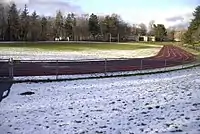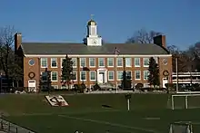 The many sports facilities are shared by various teams. The main artificial turf field is used for competition by several of the school's teams including football and lacrosse. It is enclosed by a 400-meter track equipped with steeplechase and long jump areas as well as an electronic scoreboard and two-story press box. The rear of the school contains an updated baseball field, tennis courts, and areas for field sports. A fitness and weights room was recently renovated for use by athletes.[27]