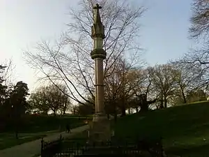 A memorial to the martyrs was erected in Christchurch Park in 1903, a short distance from Christchurch Mansion. It can be found by walking from the front of the mansion towards the children's play area. The monument has a square, stone base that bears a testament to the martyrs on the front, and lists their names on the other three sides. It was designed and executed by the Art Memorial Company of West Norwood, and is 27 ft (8.2 m) high and 10 ft 6 in (3.20 m) square at the base. The base is of Ketton stone, and the shaft of polished red granite.
