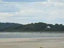 Both tributary creeks enter and mingle with the Ipswich proper in Middleton, proceed south into northern Peabody, then loop northwards through the municipalities of Danvers, Topsfield (crossing US Route 1 just south of the Topsfield Fairground, entering from the west turns northerly and runs the greater length of Teal Pond southwest to north, the east bank of which forms a part of the western border of Hamilton, and exits the lake turning easterly staying south of Ipswich Road to head through and between the Willowdale State Forest and Bradley Palmer State Park, then opens a gap from Ipswich road diverging southeasterly from the road and the south edge of the Turner Hill Golf Club to turn north and form the west border of the Julia Bird Reservation thence meanders north through settled Ipswich neighborhoods and directly through town center passing under MA 133 (County Road, aka. South Main Street) where it gradually begins widening until a mile beyond main Street it passes Nichols Field and the salt marsh floodplain begins. From Nichols it traverses a bit over 2.5 miles (4.0 km)[6] joins with Plum Island Sound in connecting with the Atlantic Ocean at Ipswich Bay.[7] There is always some flow from the river into the bay. However, the lower Ipswich and Plum Island Sound, as well as the lower four other rivers flowing into it, and the much larger Merrimack River to the north, are all tidal estuaries, so the water is brackish from mixing ocean born saltwater inland during flood tides, and the lands immediately along the banks, where not inundated some of the time, are nonetheless saturated by brackish water and support only hearty plants capable of tolerating the waters such as salt marsh hay. High tides cover all of Great Marsh and the flood plains of the lower rivers. Low tides uncover the mud flats, reducing the deep channels to small streams some often small enough one can hop across to fish elsewhere.