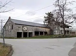The Ira Hill House stands in the village center of Isle La Motte, on the west side of Main Street north of its junction with School Street, and just south of the town hall. It consists of a stone main block, 2+1⁄2 stories in height with a gabled roof, and a long wood-frame and stone ell extending southward from its left. The main block is fashioned out of quarry-cut limestone, some of it exhibiting fossils found in the island community's limestone outcrops. It is fronted by a two-story shed-roof porch, a late 20th-century recreation of an earlier Victorian porch with turned posts and scrolled brackets. The ell has two parts: the outer end is a stone barn whose first floor was built contemporaneously to the house, and whose second floor was added about 1840. The joining section consists of a rear stone wall and a front wood frame wall.[2]