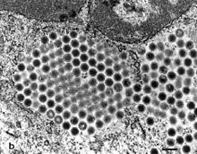Iridoviridae is a family of viruses with double-stranded DNA genomes.[1] Amphibians, fish, and invertebrates such as arthropods serve as natural hosts. There are currently 22 species in this family, divided among two subfamilies and seven genera.[1][2]