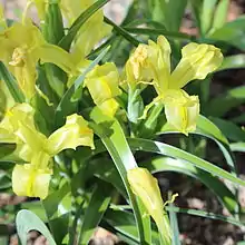 The flowers come in a range of shades of yellow, from pale yellow,[4] to soft yellow,[2] and rich-yellow.[5] The perianth tube generally is about 3 – 4.5 cm long.[3] It has falls that have a wide wing and a raised pale yellow crest, the standards are short and deflexed.[6]