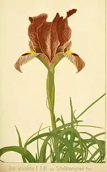 It was originally described as Iris acutiloba var. schelkownicowii by A.V. Fomin in 1904. Fomin raised it to a full species in 1909.[6][7] The Latin specific epithet schelkownikowii refers to a botanist called Alexandr Bebutovicz Schelkownikow (or Schelk.) (1870-1933).[8] He was a co-collector of plant specimens with Georg Jurij Nikolaewitch Woronow.[9]