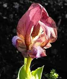 Like other irises, it has two pairs of petals, three large sepals (outer petals), known as 'falls' and three inner, smaller petals (or tepals), known as 'standards'.[24]: 17 The obovate or cuneate falls,[5] curl under themselves,[3][24]: 186 and are flaring.[18] They can be 3–5.5 cm (1–2 in) long.[14] In the middle of the falls, there is a row of short hairs called the 'beard', which is white,[18] orange,[3] or yellow,[2][10][21] on the yellow forms, but normally bluish,[2][10][21] or white tipped with blue.[20] The upright standards,[3] are shorter and wider than the falls.[5][18][24]: 186 The perianth tube is the same length as the Stigma (botany)#Style branch,[5] about 5–7.6 cm (2–3 in) long.[4] The seed capsule contains reddish brown, sub-globose seeds.[14]