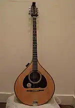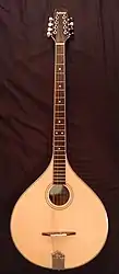 The Irish bouzouki (Irish: búsúcaí)[1] is an adaptation of the Greek bouzouki (Greek: μπουζούκι). The newer Greek tetrachordo bouzouki (4 courses of strings) was introduced into Irish traditional music in the mid-1960s by Johnny Moynihan of the folk group Sweeney's Men, who retuned it from its traditional Greek tuning C³F³A³D⁴ to G²D³A³D⁴, a tuning he had pioneered previously on the mandolin. Alec Finn, first in the Cana Band and subsequently in De Dannan, introduced the first Greek trichordo (3 course) bouzouki into Irish music.[2]
