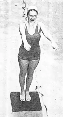 Born the year female swimmers became the first American women to achieve full Olympic status,[2] Irma began her competitive swimming career as a child at Green Lake in Seattle, having local swimming champion Helene Madison[3] as her older role model. Quickly recognized for her natural swimming ability and competitive spirit, Imgard was invited to join the swimming team of the Washington Athletic Club in 1935, soon winning numerous local, regional, statewide, and multi-state telegraph races,[4] and was a member of the 400-yard relay team that won the National Championship in 1938.[5] Groomed to compete in 1940 Summer Olympics, she continued competitive swimming after the outbreak of World War II, even though the Olympic games were suspended by the IOC. It is very likely, had it not been for the war, she would have competed on the United States Olympic swim team, possibly alongside peer, Esther Williams of California.