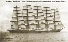 The four-masted, iron-hulled ship, introduced in 1875 with the full-rigged County of Peebles, represented an especially efficient configuration that prolonged the competitiveness of sail against steam in the later part of the 19th century.[5] The largest example of such ships was the five-masted full-rigged ship Preussen, which had a load capacity of 7,800 tons. She was also one of the fastest, regularly logging 16 knots (30 km/h) average speed on transatlantic voyages. Unfortunately speed was her undoing, as she collided with a steamer that underestimated the speed of the Preussen when crossing before her.[6] The second-largest example was France II.[7]