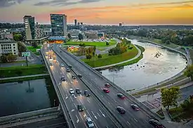 The bridge has four lanes for each way and is the widest bridge in Vilnius. It one of the busiest and most important transport arteries in Vilnius, leading to the A1 highway in the south and A2 as well as A14 highways in the north.[2][3] The bridge is located close to the Parliament of Lithuania.