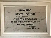 This Wikipedia article was originally based on Ironside State School, an entry in the Queensland Heritage Register published by the State of Queensland under CC-BY 4.0 AU licence, accessed on 9 November 2020.